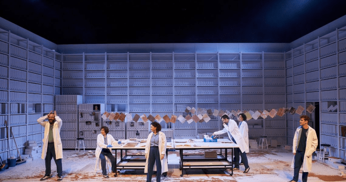 In the staging of the work for its premiere at the Teatre Nacional de Catalunya (TNC) in 2022, the imagined space of the town is portrayed as a wall of archives representing the Municipal Archives building, the place where the main character Magdalena goes to recover a sense of self and community following the disaster. All the events described by the characters in the play are acted out with moving tables or chairs and minimal props before a seemingly gigantic impersonal wall of civic history. But through the course of the play, the archives come to represent the heart of the town where Magdalena learns to face what has been in order to recover her hope to go on.